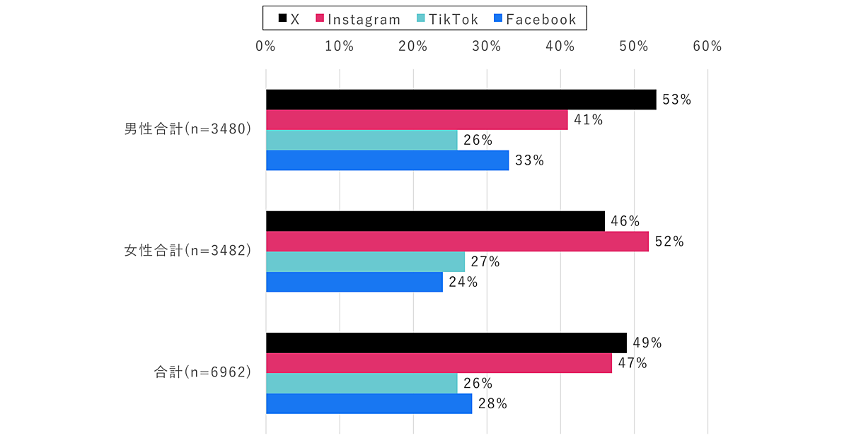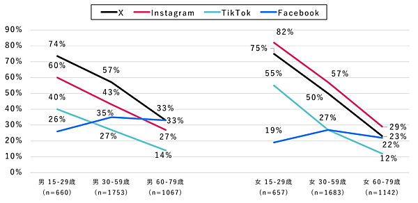性年代別に詳しく見ると、どの世代においても男性は「X」、女性は「Instagram」の利用率が高い傾向に。TikTokは10~20代の女性で55%にのぼり、若年層の支持が目立った。一方で、Facebookは60代以上の男性で33%と比較的高く、10~20代では男女ともに利用率が低い結果となった。