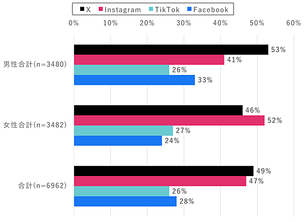 まず、SNSの利用率を見ると、「X」と「Instagram」は全体の半数近くが利用していた。男女別にみると、男性は「X」の利用率が「Instagram」よりも12ポイント高く、女性は「Instagram」の利用率が「X」よりも6ポイント高かった。なお、「TikTok」と「Facebook」はいずれも20~30%に落ち着いていた。