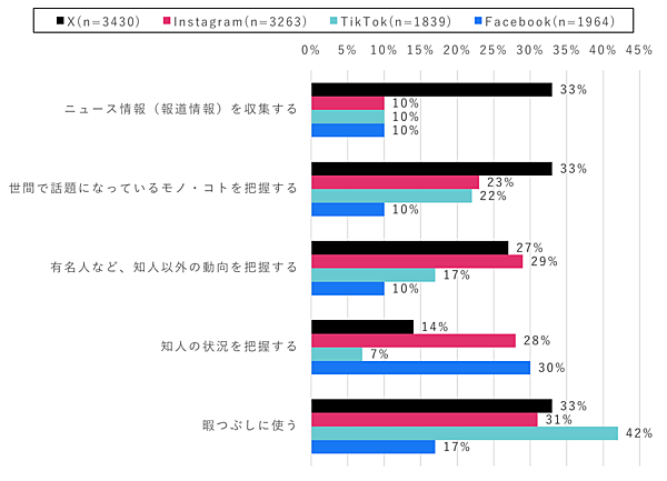 また、Xは「ニュース情報(報道情報)を収集する」と「世間で話題になっているモノ・コトを把握する」など幅広く使われていた一方で、Instagramは「有名人・知人の動向把握」が多く、Facebookは「知人の状況把握」に特化して使われていた。