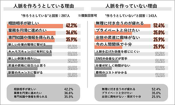 そこで「人脈を作ろうとしている」と回答した287人にその理由を聞くと、「相談相手が欲しい」42.2%、「業務を円滑に進めたい」36.6%、「専門知識や情報を得られる」35.9%が上位。「作ろうとしていない」と回答した143人にその理由を聞くと、、「プライベートと分けたい」35.0%、「出世や昇進に興味がない」「今の人間関係で十分」同率25.9%だった。功利的な理由より精神的な理由がいずれでも支持されているようだ。