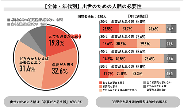 あらためて全体に「出世のための人脈の必要性」を聞くと、「必要だと思う派」が83.8%と大多数。年代別では、若い世代ほどやや高い。