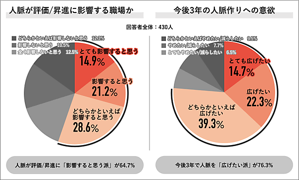 「人脈が評価/昇進に影響する職場か」については、「影響すると思う派」が64.7%と過半数。「今後3年の人脈作りへの意欲」を聞くと、「とても広げたい」14.7%、「広げたい」22.3%、「どちらかといえば広げたい」39.3%で、広げたい派が76.3%を占めた。