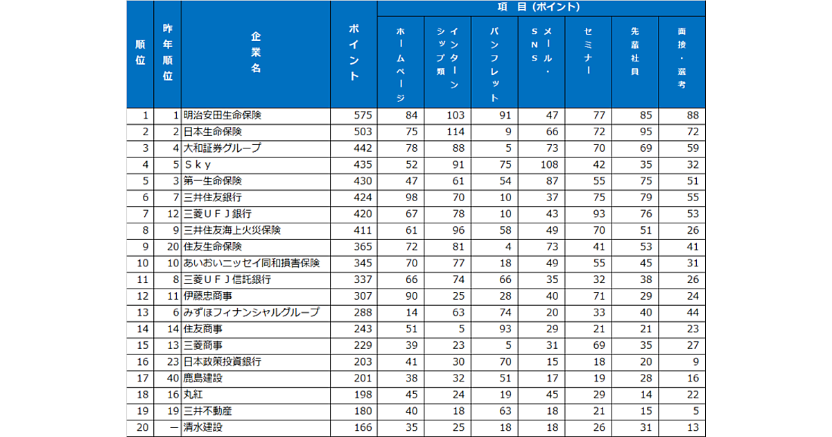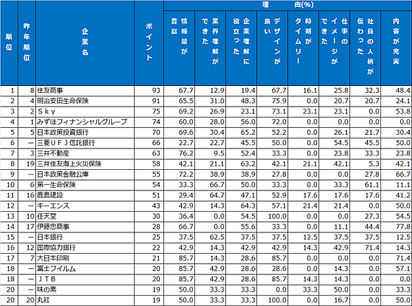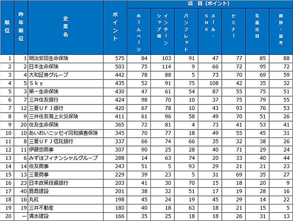 パンフレット・入社案内ランキングでは、昨年8位から大きく順位を上げた「住友商事」が1位に。2位は「明治安田生命保険」、3位は「Sky」と続いており、ホームページランキングと同様に「デザイン」や「情報量」が支持を集めた。上位の企業では、「自宅に冊子を郵送してくれた」という点も評価されていた。