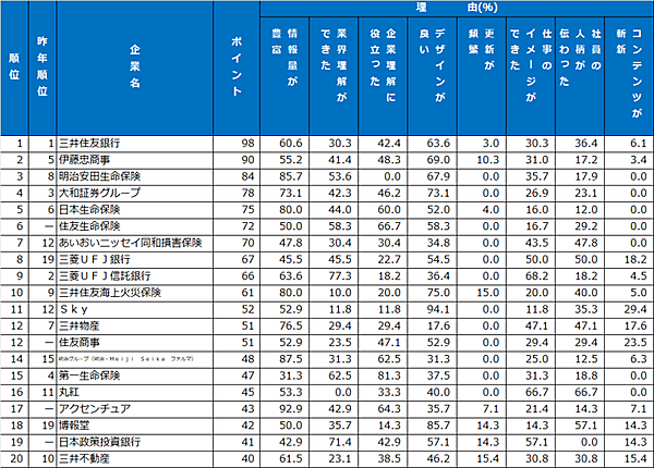 ホームページランキングでは、「三井住友銀行」が3年連続の1位に。「コース別採用の説明が分かりやすかった」と好評だった。2位は「伊藤忠商事」が入り、いずれも「豊富な情報量」と「洗練されたデザイン」が高く評価されていた。