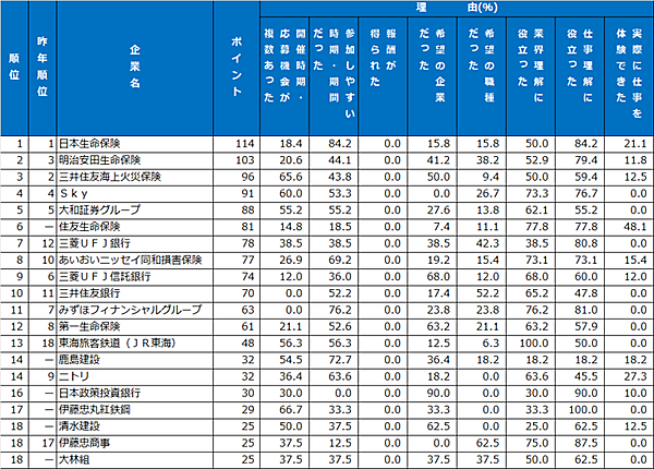 インターンシップ類ランキングでは、「日本生命保険」が2年連続の首位を獲得。「参加しやすい時期だった」ことに加え、「仕事理解・業界理解に役立った」という意見が多く見られた。2位は「明治安田生命保険」、3位は「三井住友海上火災保険」と続いている。
