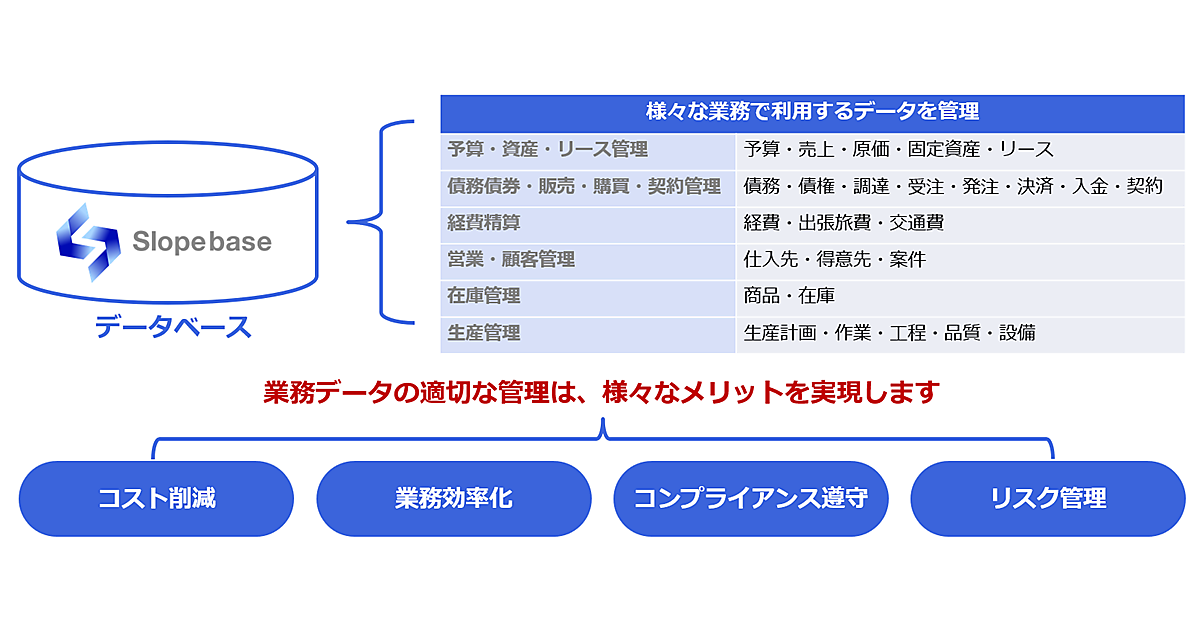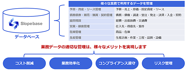 NTTデータの子会社で情報システム関連事業を手掛けるNTTデータビジネスブレインズは、新サービスとなる支出管理クラウド「Slopebase(スロープベース)」を10月7日に始めた、と同日発表した。社内に分散している業務データをクラウド上のウェブデータベースに統合・管理するサービス。適切な管理には業務効率化、コスト削減、リスク管理などの利点があるという。