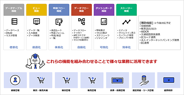 対象の業務データは、予算・資産・リース管理▽債務債券・販売・購買・契約管理▽経費精算▽営業・顧客管理▽在庫管理▽生産管理--。ノーコードで組み立ててシステムをつくるため導入時の開発は不要。チーム単位で始めて全社利用への拡大も可能。業務のデジタル化が進展する一方、システムやサービスが乱立した状態になっている企業も多いことから提供する。