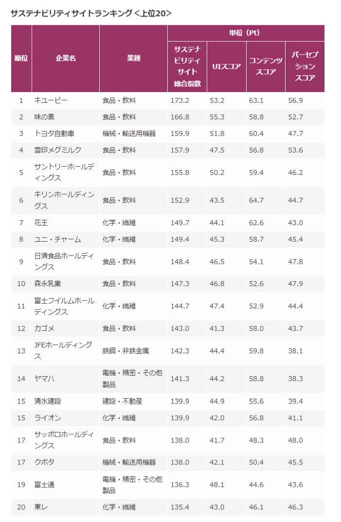 その結果、サステナビリティサイトランキングトップは「キユーピー」となった。キユーピーのサイトでは、「サステナビリティへの理念・ビジョン」「活動目標・実績」など掲載されており、「食を通じた社会貢献」といったキユーピーらしさを感じさせる情報発信がなされていた。