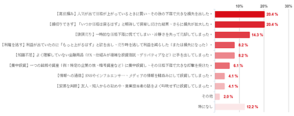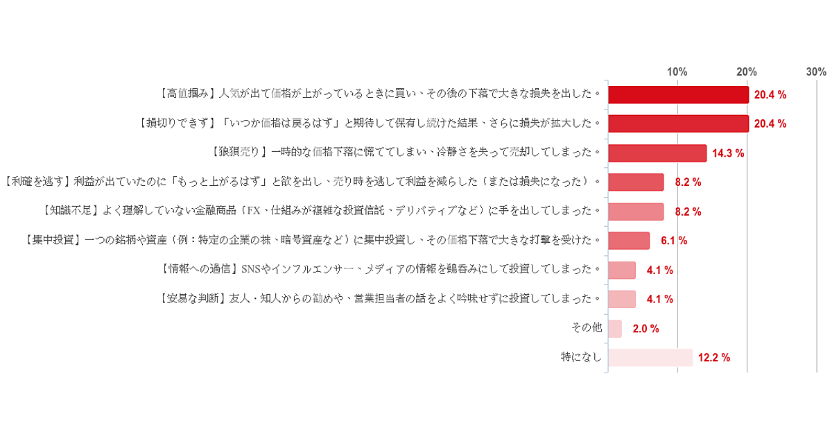 最後に、資産運用の失敗談を聞くと、最も多かったのは「高値掴み」と「損切りできず」だった。「高値掴み」とは、人気が出て価格が上がっているときに買い、その後の下落で大きな損失を出すこと。また、「損切りできず」とは、「いつか価格が戻るはず」と期待して保有した結果、さらに損失が拡大することを指す。