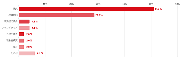 まず、運用している金融商品を聞くと、「株式」が51.0%で最も多く、ついで「投資信託」が28.6%となった。その他、「外貨建て債券」「ファンドラップ」など、多様な商品があげられた。