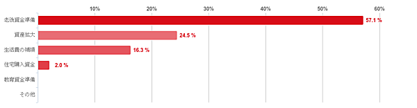 運用の主な目的としては、「老後資金準備」が57.1%で圧倒的に多く、以下「資産拡大」が24.5%、「生活費の補填」が16.3%と続いた。