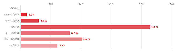 運用時に目標にしている利回りを聞くと、「4~6%未満」が36.7%で最も多く、「2~4%未満」が32.7%、「2%未満」が14.3%と続いた。また、過去1年間の実際の運用成績を聞くと、「±5%未満」が42.9%で最多となり、マイナスとなっている人は少数派だった。