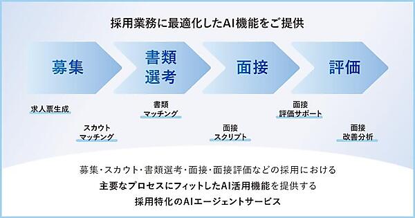 少子高齢化による労働人口の減少で人材獲得競争が激しくなる中、採用現場での人事担当者の負担を軽減する。人事担当者は求人票作成、採用候補者のスカウト、書類選考、面接の準備・評価の各業務に追われ、候補者との対話や体験設計に時間を割けなかったり、面接官による評価のばらつきが解消できなかったりする課題を抱えている。