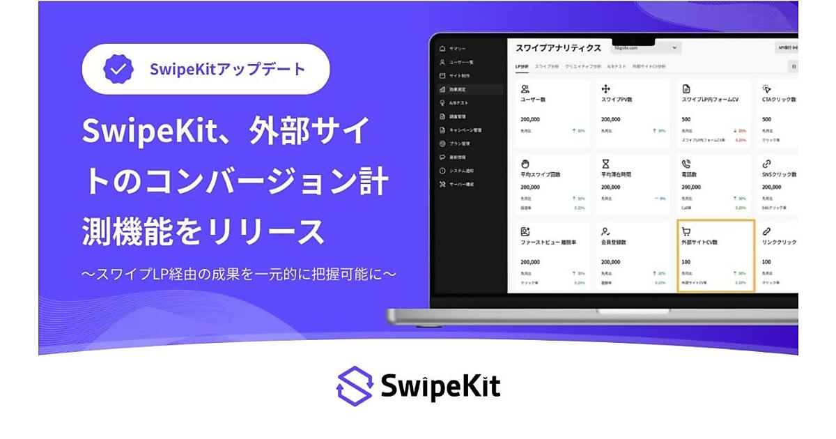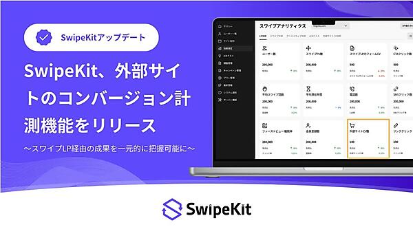 PR事業のベクトルの子会社でウェブマーケティング・SaaS事業を行うトライハッチは、同社が展開するスワイプ型のLP(ランディングページ)制作・分析ツール「SwipeKit」で、外部サイトのCV(コンバージョン)=最終成果=が計測できる機能の提供を始めた、と10月8日発表した。SwipeKit上の閲覧データと外部サイトでのCVが一元的に分析可能になった。