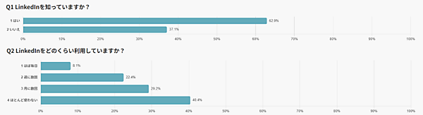 まず、「LinkedIn(リンクトイン)」を知っているかを聞くと、62.9%が「知っている」と回答した。一方で、LinkedInを認知していると答えた人に対し、利用頻度を聞くと、「ほとんど使わない」が40.4%で多数派に。「週に数回」は30.5%、「ほぼ毎日利用している」は8.1%にとどまり、日常的に活用している人は少数派であることがわかった。