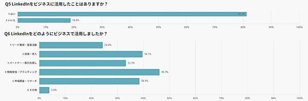 続いて、LinkedInを業務上で活用した経験があるかを聞くと、81.3%が「経験あり」と答えた。具体的な活用シーンとしては、「情報発信・ブランディング」が46.2%で最も多く、ついで「採用・求人」が39.7%となった。実名登録と職歴公開を前提としているため、企業・個人双方にとって信頼性の高い情報発信チャネルとなっていることがうかがえた。