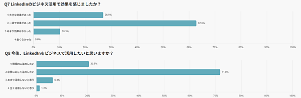 最後に、LinkedInをビジネスで活用したことで、何らかの効果を感じたかを聞くと、89.7%が「成果を感じた」と回答した。今後の継続意向としては、積極的に活用したい・必要に応じて活用したいの合計が92.3%にのぼっており、ビジネスツールとして定着しつつあることがわかった。