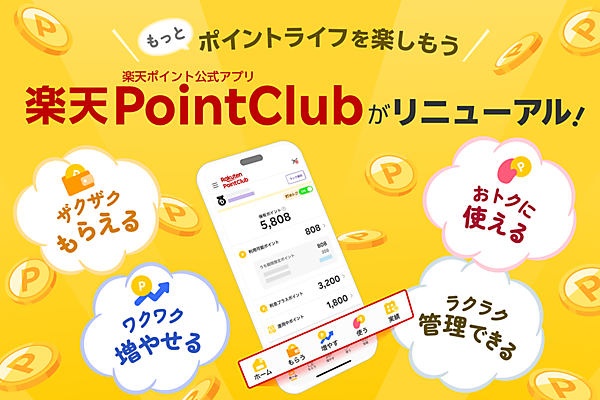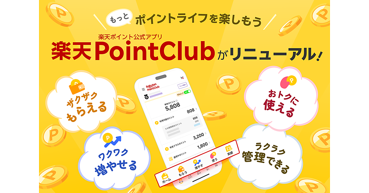 楽天グループは、同社グループが展開するポイントプログラム「楽天ポイント」の獲得・利用の状況などが分かるスマートフォン向け公式アプリ「楽天PointClub」を刷新した、と10月9日発表した。「ポイントライフを楽しもう!」をテーマにデザインを一新し、目的別のタブ構成にして1つのアプリで必要な情報にアクセスできるようにした。
