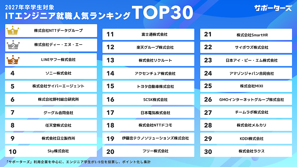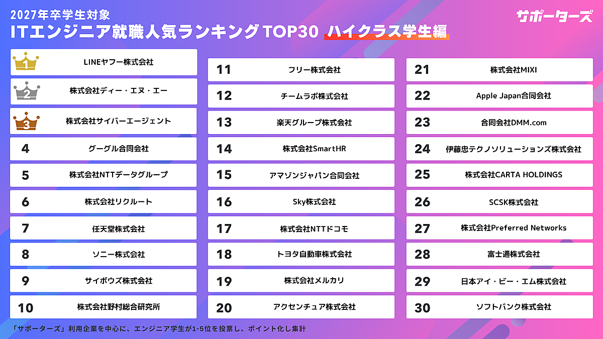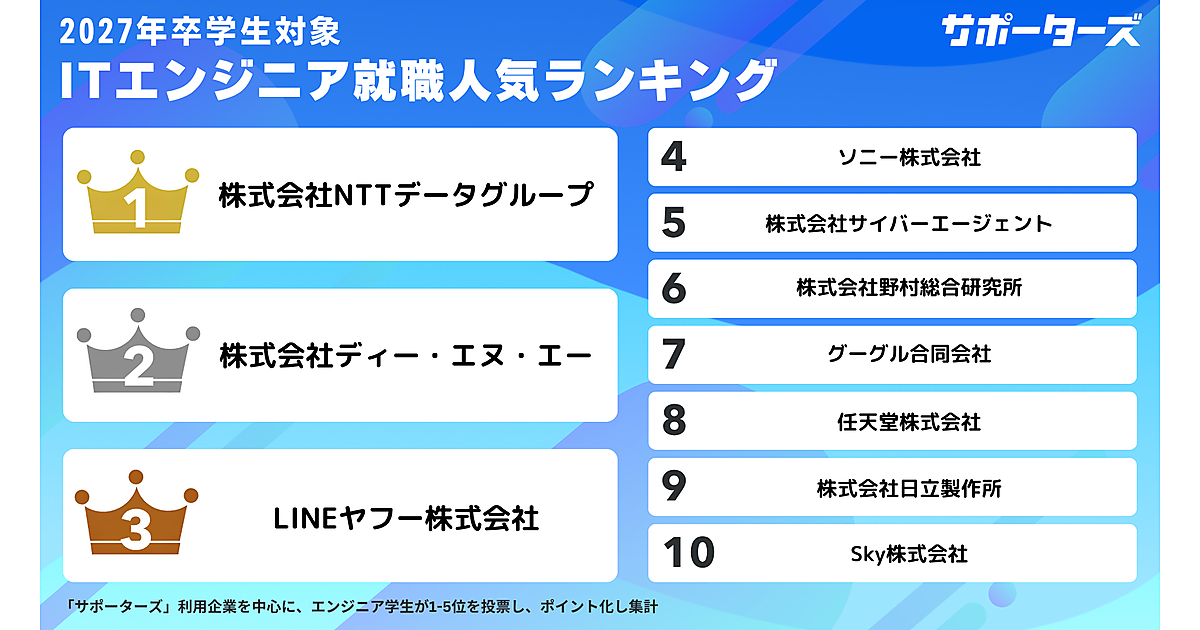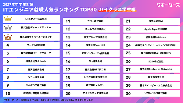 CARTA HOLDINGSのグループ会社であるサポーターズは、「2027年卒エンジニア学生対象 就職人気企業ランキング」を発表した。エンジニア職での就職を志望している学生366名が回答している。本調査は3回目の実施となる。