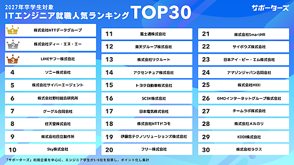 27卒ITエンジニア学生が選ぶ! 就職人気企業ランキングTOP30