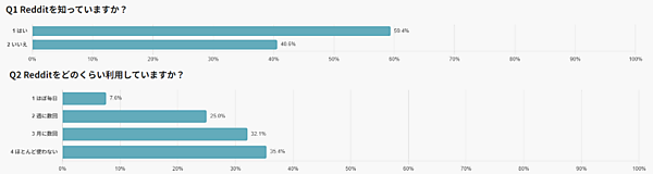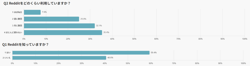まず、Redditを知っているかを聞くと、59.4%が「知っている」と回答した。また、Redditを知っていると答えた人に対し、利用頻度を聞くと「ほとんど使わない」が35.4%、「月に数回」が32.1%で多数派に。「ほぼ毎日利用している」は7.6%にとどまり、日本での利用はまだ浸透していないことがうかがえた。