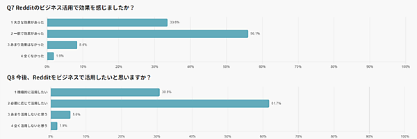 最後に、Redditをビジネスで活用したことで、何らかの効果を感じたかを聞くと、33.6%が「大きな効果があった」、56.1%が「一部で効果があった」と回答した。今後の継続意向としては、「積極的に活用したい・必要に応じて活用したい」の合計が92.5%にのぼっており、現場での活用が進みつつあることがわかった。