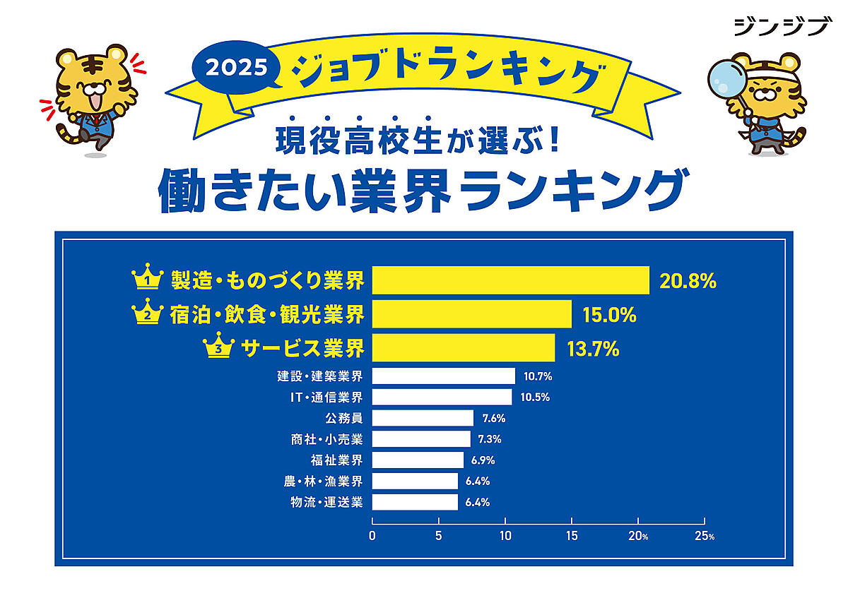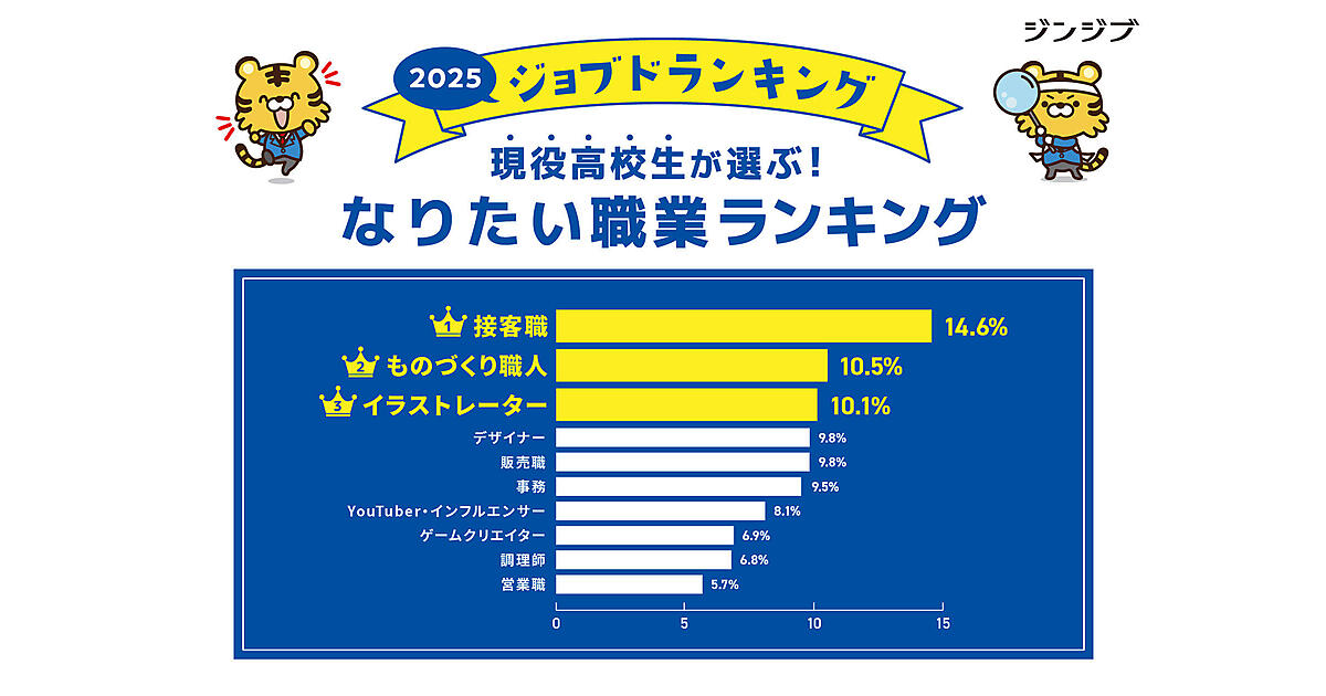 ジンジブは、「現役高校生が将来なりたい職業」に関する調査結果を発表した。高校生向けの職業体験イベント「おしごとフェア2025」に参加した現役高校生1,746人が回答している。