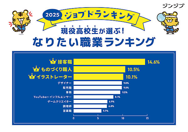 まず「就職するとしたらどんな職業に就きたいですか?」と聞くと、「接客職」14.6%が前年に続き3年連続で1位だった。以下「ものづくり職人」10.5%も前年同様に2位。3位は「イラストレーター」10.1%が前年4位から1ランクアップした。