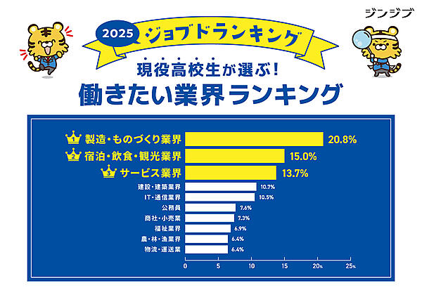 一方で「どの業界で働きたいですか」と聞くと、「製造・ものづくり業界」20.8%が前年と同じくトップで、職業との微妙なズレも感じられる。以下「宿泊・飲食・観光業界」15.0%、「サービス業界」13.7%が続くが前年と順位が入れ替わった。