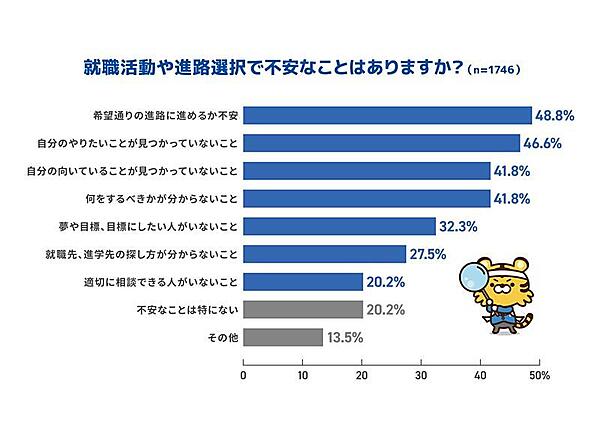 「進路を選択する上での不安」については、「希望通りの進路に進めるか不安」48.8%、「自分のやりたいことが見つかっていないこと」46.6%、「自分の向いていることが見つかっていないこと」41.8%、「何をするべきかが分からないこと」41.8%などが上位で、多くの高校生が不安を抱えておりキャリア教育やサポートの重要性がうかがえる。
