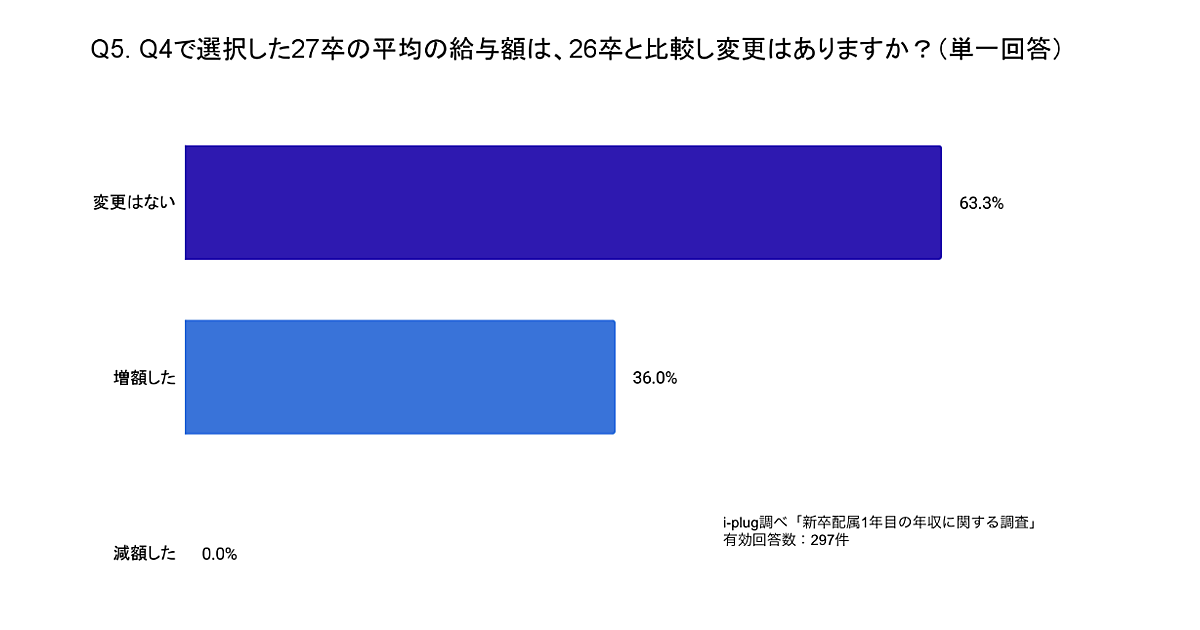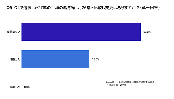 また、2027年卒の平均給与額について、前年(2026年卒)からの変化を聞いたところ、「変更はない」が63.3%、「増額した」が36.0%となり、約3社に1社が新卒の平均給与額を引き上げたことがわかった。