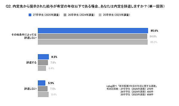 内定先から提示された給与が希望の年収以下である場合、内定を辞退するかという質問では、85.6%が「その他条件によっては辞退しない」と回答。過去調査との大きな差はなかったが、「辞退する」の割合は3年連続で微増していた。