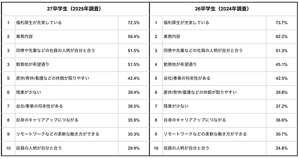 「その他条件によっては辞退しない」と答えた人に対し、具体的にどの条件を重視するかを聞くと、「福利厚生が充実している(72.3%)」が圧倒的に多く、ついで「業務内容(58.4%)」、「同僚や先輩などの社員の人柄が自分と合う(51.5%)」と続いた。