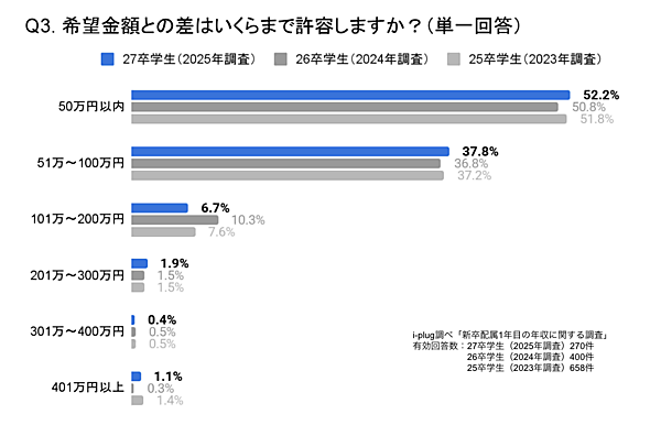 また、希望金額との差はいくらまで許容できるかという質問では、「50万円以内」が52.2%で最も多く、「51万円〜100万円」が37.8%と続いた。このことから、学生の大半が希望年収との差を「100万円以内」と捉えていることがわかった。