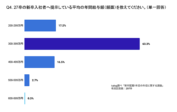 一方で、採用活動を行っている企業に対し、2027年卒の学生に提示している平均の年間給与額を聞くと、「300~399万円」が63.3%で最多となった。「500万円以上」と回答した企業は合計で3.0%にとどまった。