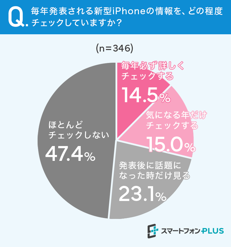 まずは「毎年発表される新型iPhoneの情報を、どの程度チェックしているか」を聞くと、「ほとんどチェックしない」47.4%がほぼ半数。以下「発表後に話題になったときだけ見る」23.1%、「気になる年だけチェックする」15.0%、「毎年必ず詳しくチェックする」14.5%が続いた。チェックしない人が主流ながら、かならずチェックする人も一定数存在するようだ。