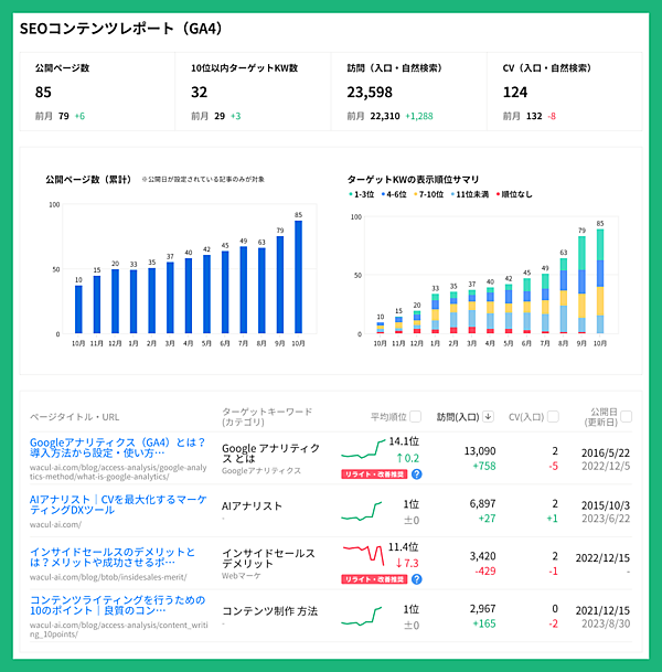 リライトが必要と判定されたページには、レポート画面上で「リライト・改善推奨」ラベルを表示する。優先的に改修すべきページを簡単に特定できるので、改善が必要なページを迅速に把握して効果的な施策実行につなげることができ、SEO施策の打ち手の検討やリソース配分を最適化することができる。