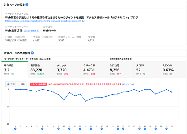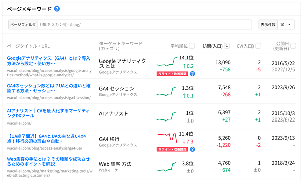 AIアナリストの「SEOコンテンツレポート」に登録されたキーワード別の検索順位・流入数・コンバージョン数などのパフォーマンスデータから、リライトによる改修が必要なページを特定する。公開または更新から約半年以上が経過したページが対象で、分析期間内で平均順位が11位以下の場合は、そのページを「リライト推奨」と自動判定する。