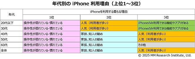 「iPhoneを利用している理由」については、「操作性が優れている・慣れている」27.7%、「家族、知人の勧め」11.6%、「人気(利用者が多い)」9.1%が上位。年代別で見ると、すべての年代で「操作性が優れている・慣れている」が1位だが、30代以下では「人気(利用者が多い)」が2位、40代以上では「家族、知人の勧め」が2位となっている。