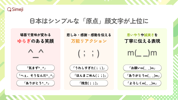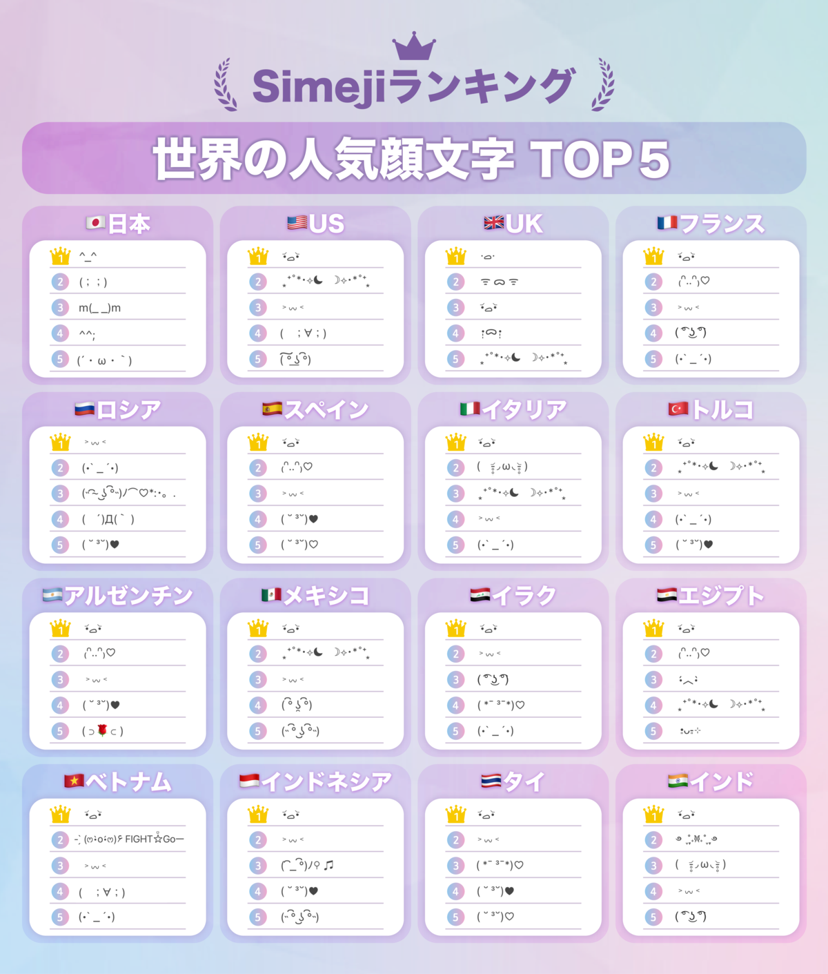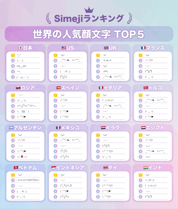 バイドゥが提供する顔文字キーボードアプリ「Simeji(シメジ)」は、「世界の人気顔文字 TOP5」を発表した。世界16か国において、2025年に最も多く使われた顔文字を調べている。