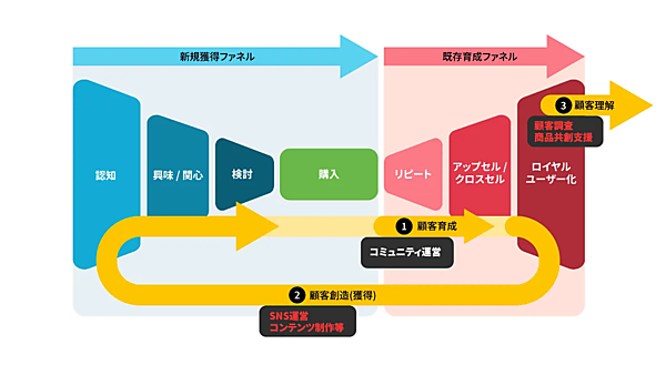 コミュニティ内での信頼関係育成に加えて、ロイヤル(優良)ユーザーのデータから商品開発や顧客調査、新規顧客獲得のプロモーションなど幅広く支援する。戦略策定フェーズではファン理解の調査やコミュニティマーケティング戦略を策定する。実行フェーズではコミュニティの活性化支援やイベント開催などの運営支援のほか、SNS運用、デジタル広告、SEO(検索エンジン最適化)対策などプロモーション、商品共創を支援する。