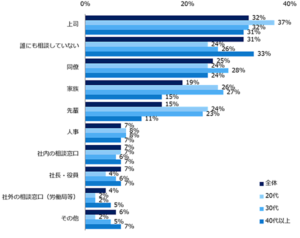 ハラスメント経験者に「誰かに相談しましたか?」と聞くと、「上司」32%、「誰にも相談していない」31%、「同僚」25%が上位。性年代別では、男性や高齢者ほど「誰にも相談していない」が多い。