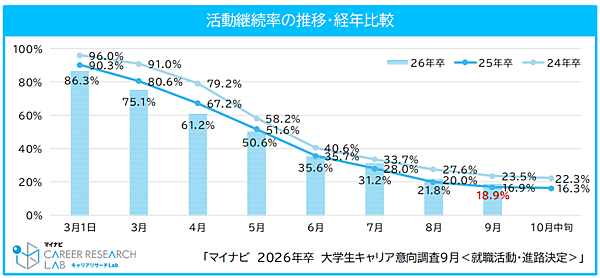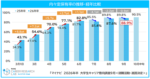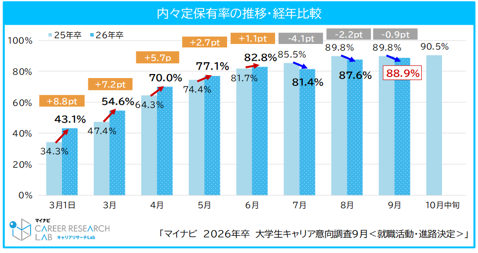 26卒就活、9月の内定保有率は88.9%・活動継続率は18.9%