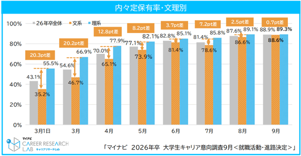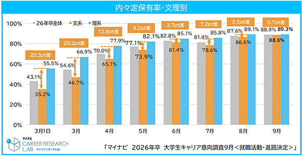 まず、9月末時点の内々定保有率は88.9%で、前年同月から0.9ポイント減少した。文理別で見ると、文系学生は88.6%、理系学生は89.3%となっており、3月1日時点で20.3ポイントあった差は、0.7ポイントまで縮まっていた。