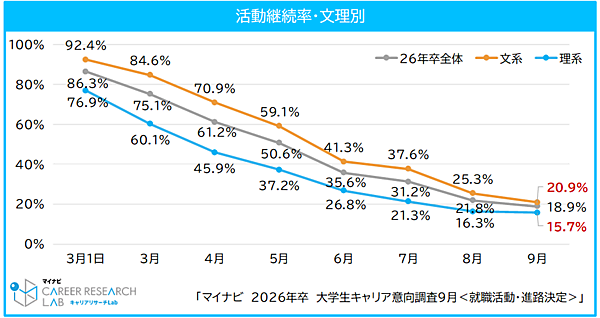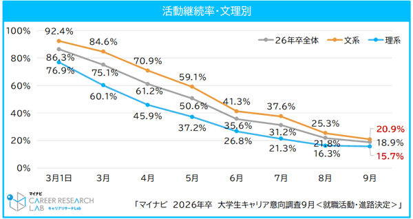 9月の活動継続率は18.9%で、前年同月の16.9%をわずかに上回る結果に。文理別では、文系学生は20.9%、理系学生は15.7%となり、5.2ポイントの差がついた。もともと理系学生の方が活動継続率は低い傾向にあるが、3~4月調査と比べると、こちらも文理差は縮小している。