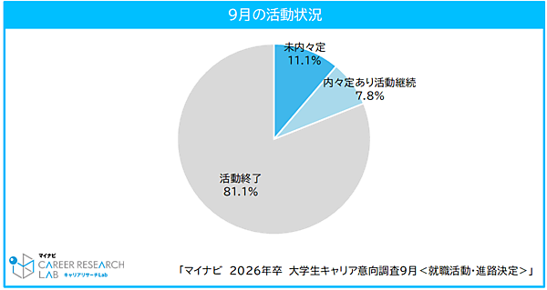 9月末時点の就職活動の状況を見ると、未内々定者は11.1%、内々定を持ちながら活動を続けている学生は7.8%で、81.1%の学生はすでに活動を終了していた。