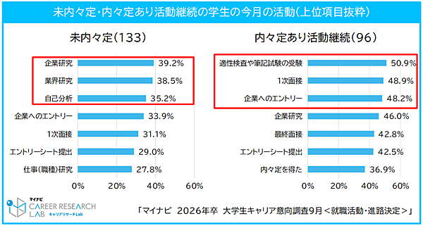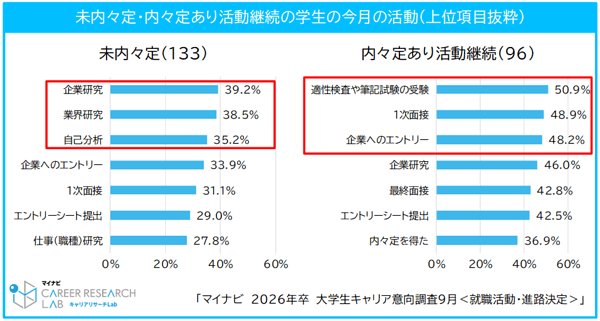 一方で、内々定あり活動継続者は「適性検査や筆記試験の受験(50.9%)」「1次面接(48.9%)」「企業へのエントリー(48.2%)」などが多く、実際の選考プロセスに進んでいる傾向が見られた。