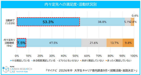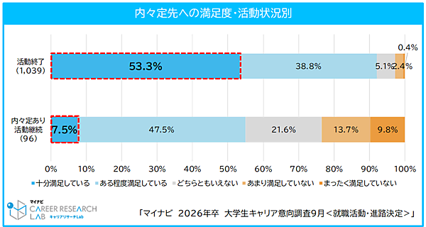 最後に、内々定先への満足度を聞くと、「十分満足している」の割合は就職活動終了者で53.3%、内々定あり活動継続者で7.5%となり、45.8ポイントの差が見られた。