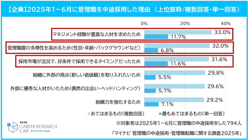 「管理職の採用理由」(複数回答)を聞くと、「マネジメント経験が豊富な人材を求めたため」33.0%が最多で、「管理職層の多様性を高めるため(性別・年齢・バックグラウンドなど)」32.0%がそれに続いた。もっともあてはまるもの(単一回答)で見ると「採用市場が活況で、好条件で採用できるタイミングだったため」11.6%も多い。