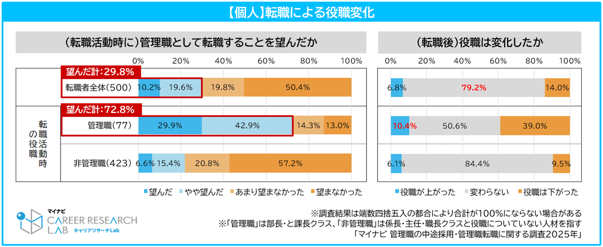 マイナビは、「管理職の中途採用、管理職の転職」に関する調査結果を発表した。企業:1,600社/個人:500人が回答している。人事担当者と、直近1年以内に転職した20~50代の正社員男女が対象。